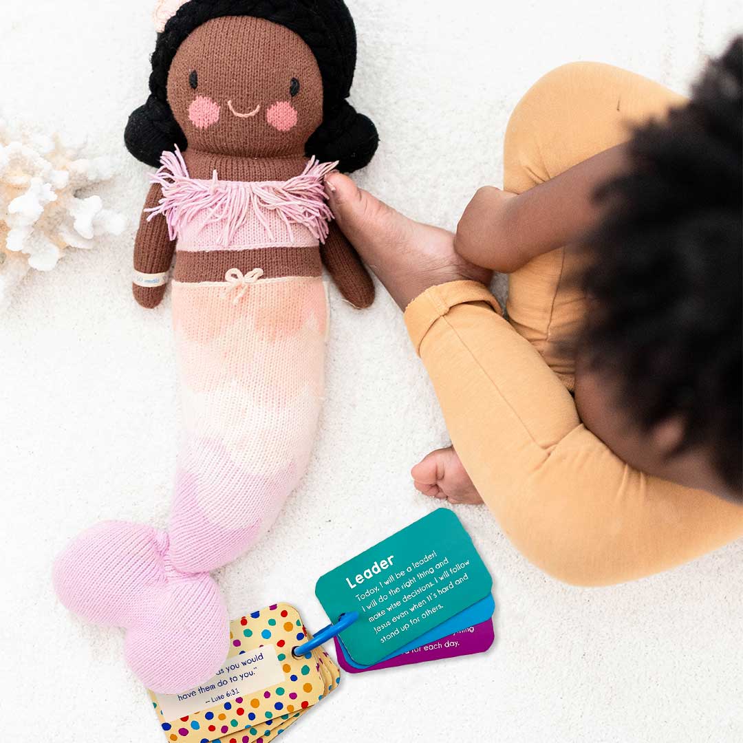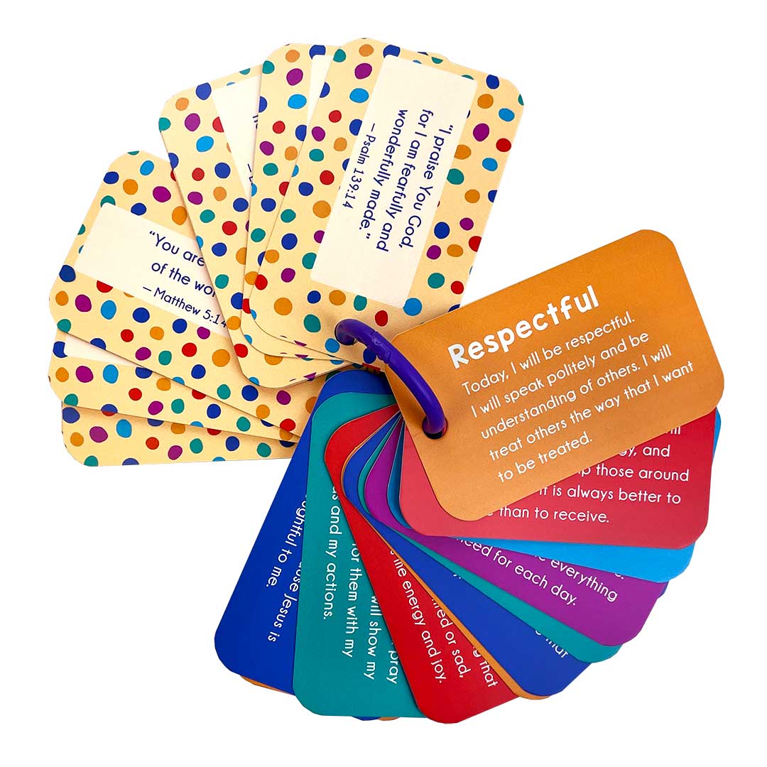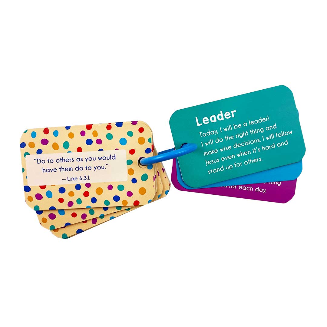 Each card includes a trait with a short application explaining how they can practice that trait today. On the back of each card is a scripture that correlates to that trait and helps your little one see how The Bible talks about it too!