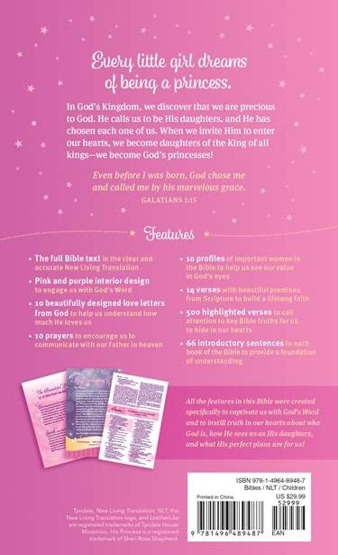 All the features in this NLT Bible were created specifically to captivate little girls with God’s Word and to instill truth in their hearts about who God is, how He sees them as His special daughters, and the perfect plans He has for them!